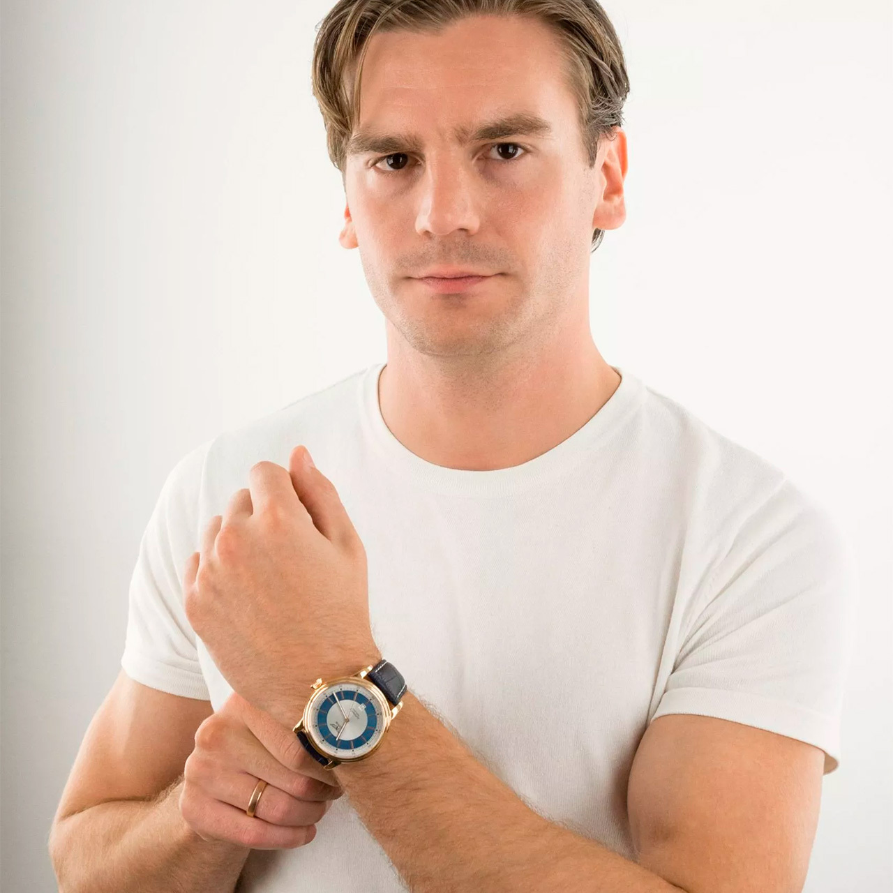 Ремешок: Синий ремешок из телячьей кожи с тиснением под аллигатора. Ремешок снабжен удобной раскладной застежкой, которая закрывается одним щелчком.