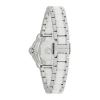 Корпус: Корпус из нержавеющей стали. Полированный неподвижный безель из стали и белой керамики с выгравированной минутной шкалой. Устойчивое к царапинам сапфировое стекло. Белый циферблат. 48 розовых сапфиров на безеле, 12 розовых сапфиров на циферблате. Диаметр 32 мм. Водостойкость 200 м.