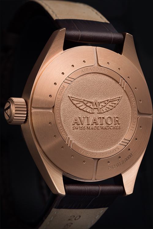 Задняя крышка часов напоминает обшитый металлическими листами фюзеляж истребителя Airacobra, а выгравированные надписи крышки ассоциируются со спецификациями самолета. Укрупненная закручивающая заводная головка надежно защищает от попадания в механизм воды и позволяет с легкостью подкручивать ее даже в толстых перчатках, как это делали пилоты 40-х годов.