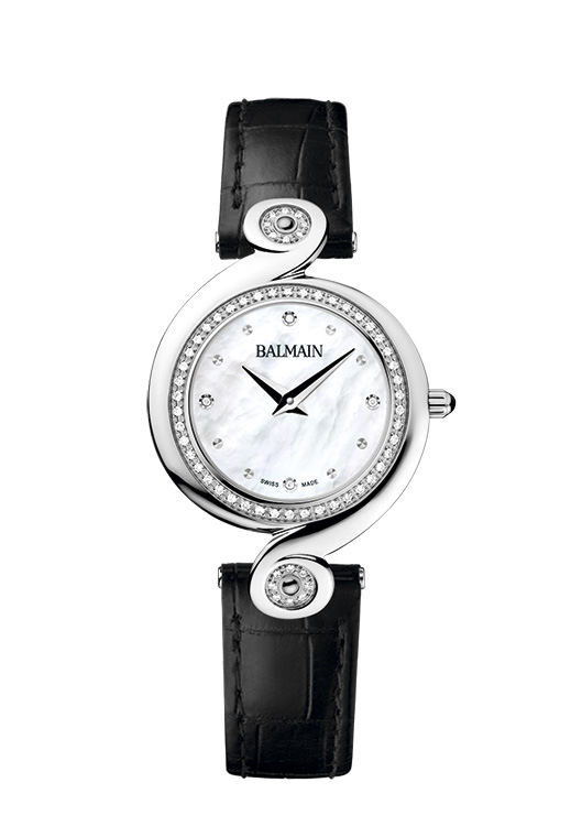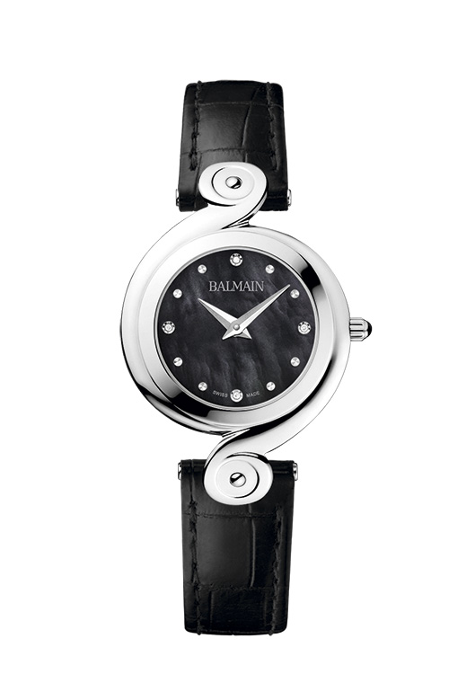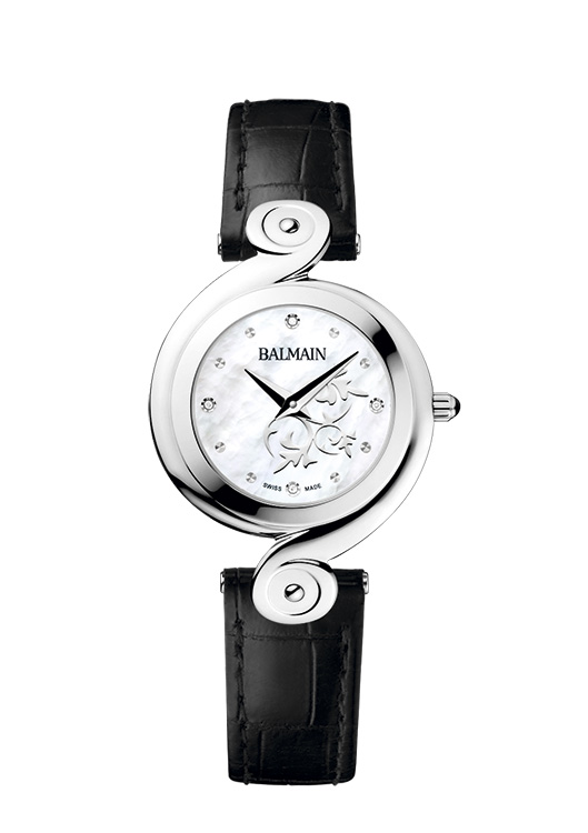 2. Balmain Kerria B4171.32.83 Стальной полированный корпус. Белый перламутровый циферблат с центральными гранёными полированными стальными стрелками часов и минут, с четырьмя бриллиантами в виде условных индексов, с фирменным серебристым узором в форме арабески. Чёрный ремешок из натуральной кожи с полированной стальной застёжкой. |