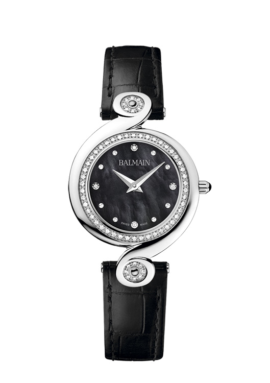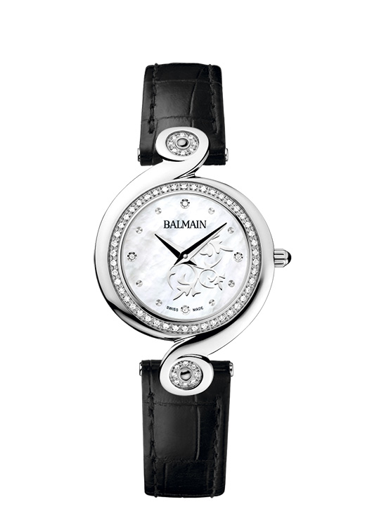 Чёрные или белые перламутровые циферблаты часов «Balmain Kerria» с центральными гранёными полированными (жёлто-золотыми или розово-золотыми) стальными стрелками часов и минут украшены четырьмя бриллиантами в виде условных индексов, а некоторые циферблаты декорированы фирменным серебристым, жёлто-золотым или розово-золотым узором арабеска***.