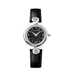 4. Balmain Kerria B4175.32.66 Стальной полированный корпус с шестьюдесятью двумя бриллиантами. Чёрный перламутровый циферблат с центральными гранёными полированными стальными стрелками часов и минут и четырьмя бриллиантами в виде условных индексов. Чёрный ремешок из натуральной кожи с полированной стальной застёжкой. |