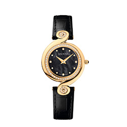17. Balmain Kerria B4173.32.86 Стальной полированный корпус с жёлто-золотым PVD-покрытием и шестьюдесятью двумя бриллиантами. Белый перламутровый циферблат с центральными гранёными стальными, с жёлтой позолотой, стрелками часов и минут, с четырьмя бриллиантами в виде условных индексов. Чёрный ремешок из натуральной кожи с застёжкой из стали с жёлтой позолотой. |