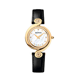 8. Balmain Kerria B4170.32.83 Стальной полированный корпус с жёлто-золотым PVD-покрытием. Белый перламутровый циферблат с центральными гранёными стальными, с жёлтой позолотой, стрелками часов и минут, с четырьмя бриллиантами в виде условных индексов, с фирменным жёлто-золотым узором в форме арабески. Чёрный ремешок из натуральной кожи с застёжкой из стали с жёлтой позолотой. |