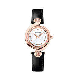 13. Balmain Kerria B4179.32.83 Стальной полированный корпус с розово-золотым PVD-покрытием. Белый перламутровый циферблат с центральными гранёными стальными, с розовой позолотой, стрелками часов и минут, с четырьмя бриллиантами в виде условных индексов, с фирменным розово-золотым узором в форме арабески. Чёрный ремешок из натуральной кожи с застёжкой из стали с розовой позолотой. |