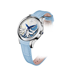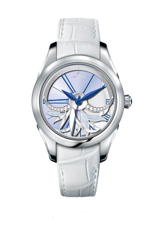 Цвет привлек дизайнеров Perrelet и вылился в итоге в очень красивую коллекцию Diamond Flower Amytis. Этот швейцарский часовой дом славится оригинальностью своих циферблатов, которые «оживляют» запатентованный в 1995 году двойной ротор - фирменный знак бренда. Но в новой коллекции часы стали еще более художественными, а циферблат выдержан в нежнейших оттенках кремового и голубого.