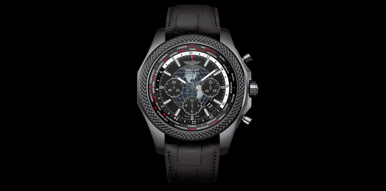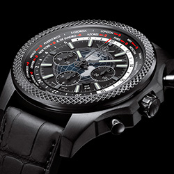 Ограниченным тиражом 500 экземпляров вышел хронограф Bentley B05 Unitime в версии с черным корпусом из матовой стали. Breitling не первый год сотрудничает с престижной автомобильной маркой, и каждый раз союз выливается в нечто особенное. Эффектность достигается за счет нанесения высокопрочного покрытия на углеродной основе, черного циферблата с выпуклым узором в виде земного шара и совершенно нового ремешка, в котором каучуковая основа дополнена внешним слоем из матовой крокодиловой кожи.