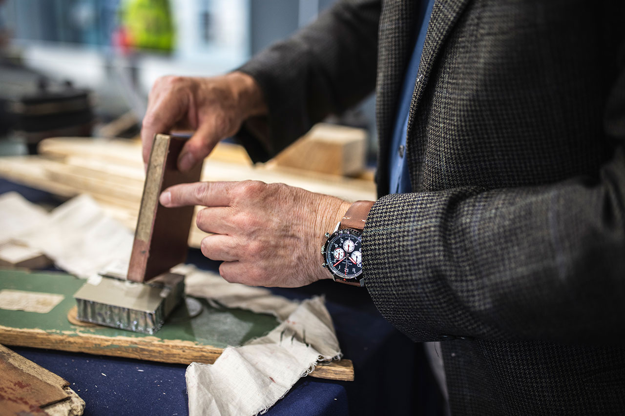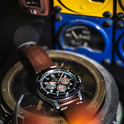 На яркую центральную часовую стрелку оранжевого цвета, а также минутную и центральную секундную стрелки нанесено люминесцентное покрытие по технологии Super-LumiNova®, которое гарантирует удобство считывания времени при любом уровне освещенности. Динамичные красно-оранжевые акценты напоминают опознавательные знаки на фюзеляже самолетов de Havilland Mosquito и подчеркивают уникальный характер модели. Стрелка малого секундного счетчика покрыта черным лаком. На циферблате в положении между «4» и «5» часами находится окошко индикации даты.