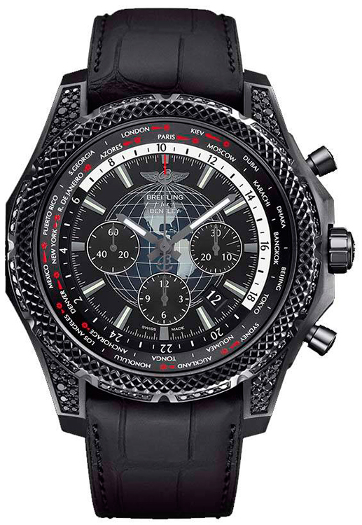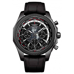 1. Breitling Bentley B05 Unitime Midnight Carbon MB0521V4/BE46/265S/M20DSA.2 Корпус из нержавеющей стали с матовой отделкой и чёрным карбоновым покрытием. Безель чёрного цвета с аутентичной декоративной текстурой. Чёрный (Royal Ebony) циферблат с центральными стрелками, окошком даты, условными индексами и тремя субциферблатами. Чёрный ремешок на каучуковой основе с внешним слоем из матовой крокодиловой кожи. Раскладывающаяся стальная застёжка с чёрным карбоновым покрытием. Ограниченная серия в количестве 500 экземпляров. |