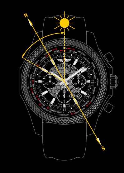 В южном полушарии индекс 12-часовой отметки направляется точно к солнцу. В середине отрезка между местным временем и 12-часовой отметкой на циферблате находится север, юг – в диагонально противоположной стороне циферблата. |