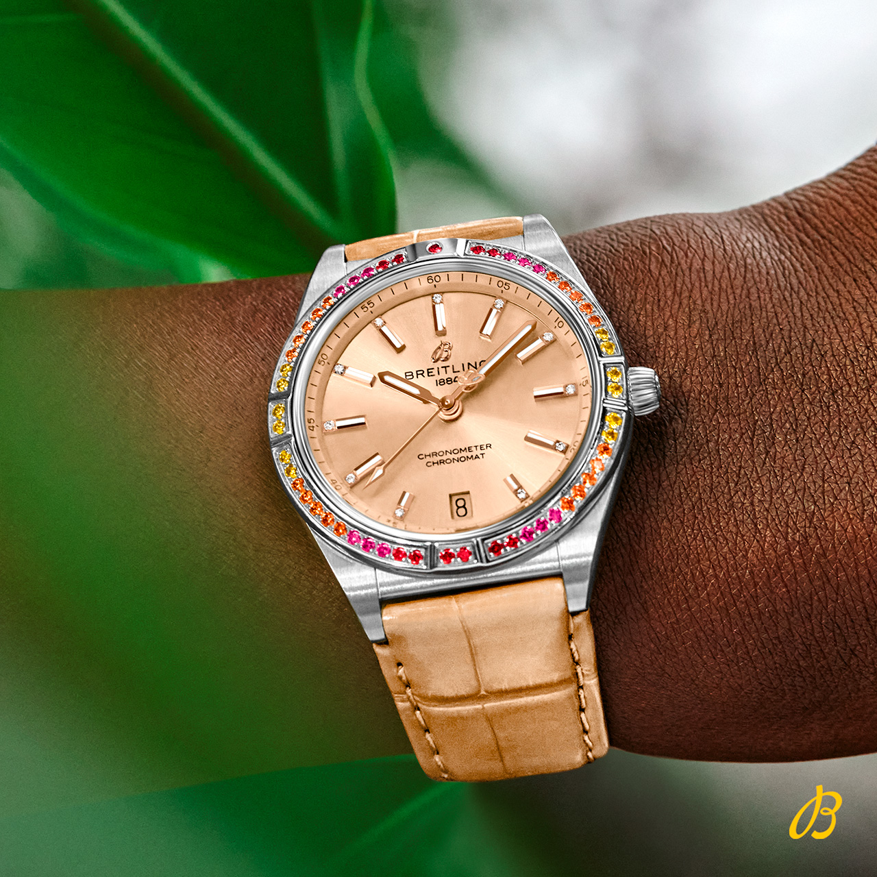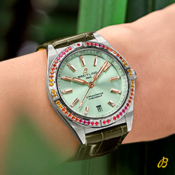 Часы из новой капсульной коллекции Chronomat Automatic 36 South Sea легко узнать по специальным лакированным циферблатам в бежевом, полуночном синем и мятно-зеленом цвете, а также безупречно подобранным ремешкам из кожи аллигатора с раскладными застежками. Особого внимания заслуживают золотые индексы и стрелки, не говоря уже об инкрустированных бриллиантами часовых маркерах и украшенных драгоценными камнями радужных оттенков безелях.
