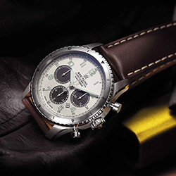 Изысканный серебристый циферблат, контрастный хронограф антрацитового цвета и небольшие секундные счетчики – безупречный дизайн часов притягивает взгляд. Сквозь прозрачную заднюю крышку корпуса, выполненную из сапфирового стекла, можно наблюдать за работой суперсовременного часового механизма. Новая модель отличается характерным сатинированным безелем: помимо удобного указателя на нем также располагаются индексы и арабские цифры. Часы дополняет коричневый кожаный ремешок.