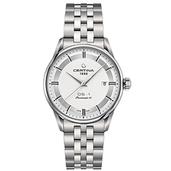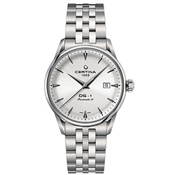 7. Certina DS-1 Powermatic 80 C029.807.11.031.00: корпус из нержавеющей стали, серебристый циферблат с никелированными стрелками и условными индексами, прозрачная задняя крышка, 5-рядный браслет из нержавеющей стали. | |