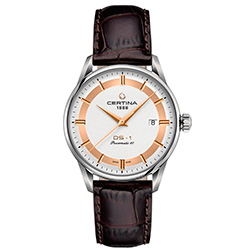 5. Certina DS-1 Powermatic 80 C029.807.16.031.01: корпус из нержавеющей стали, серебристый циферблат, стрелки и условные индексы с PVD-покрытием из розового золота, прозрачная задняя крышка, тёмно-коричневый кожаный ремешок. | |