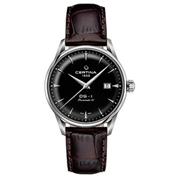 4. Certina DS-1 Powermatic 80 C029.807.16.051.00: корпус из нержавеющей стали, чёрный циферблат с никелированными стрелками и условными индексами, прозрачная задняя крышка, тёмно-коричневый кожаный ремешок. | |