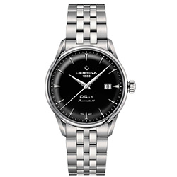 6. Certina DS-1 Powermatic 80 C029.807.11.051.00: корпус из нержавеющей стали, чёрный циферблат с никелированными стрелками и условными индексами, прозрачная задняя крышка, 5-рядный браслет из нержавеющей стали. | |