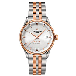 8. Certina DS-1 Powermatic 80 C029.807.22.031.00: корпус из нержавеющей стали, безель и заводная головка с PVD-покрытием из розового золота; серебристый циферблат, стрелки и условные индексы с PVD-покрытием из розового золота, прозрачная задняя крышка, 5-рядный браслет из нержавеющей стали с чётными рядами, отделанными PVD-покрытием из розового золота. | |