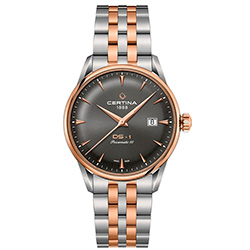 9. Certina DS-1 Powermatic 80 C029.807.22.081.00: корпус из нержавеющей стали, безель и заводная головка с PVD-покрытием из розового золота; тёмно-серый (антрацитовый) циферблат, стрелки и условные индексы с PVD-покрытием из розового золота, прозрачная задняя крышка, 5-рядный браслет из нержавеющей стали с чётными рядами, имеющими отделку PVD-покрытием из розового золота. |