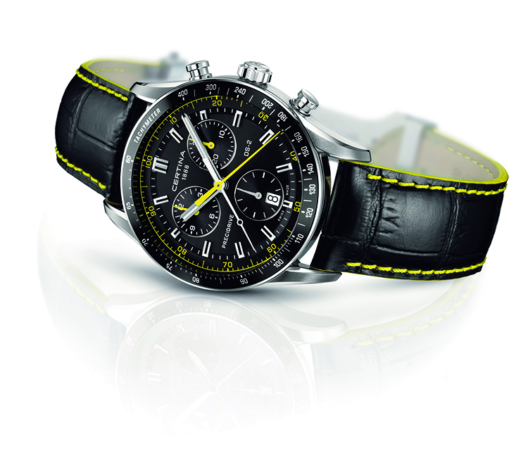 - Модель «Certina DS-2 Chronograph» C024.447.16.051.01 с чёрным циферблатом, жёлтыми стрелками 1/100-секундного, 30-минутного и 12-часового счётчиков, белой стрелкой 60-секундного счётчика и жёлтой 1/100 секундной шкалой.