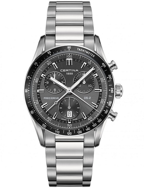 - Модель «Certina DS-2 Chronograph» C024.447.11.051.00 с чёрным циферблатом, серебристыми счётчиками хронографа, белой секундной стрелкой, белыми стрелками 1/100-секундного, 30-минутного, 12-часового, 60-секундного счётчиков и белой 1/100-секундной шкалой.