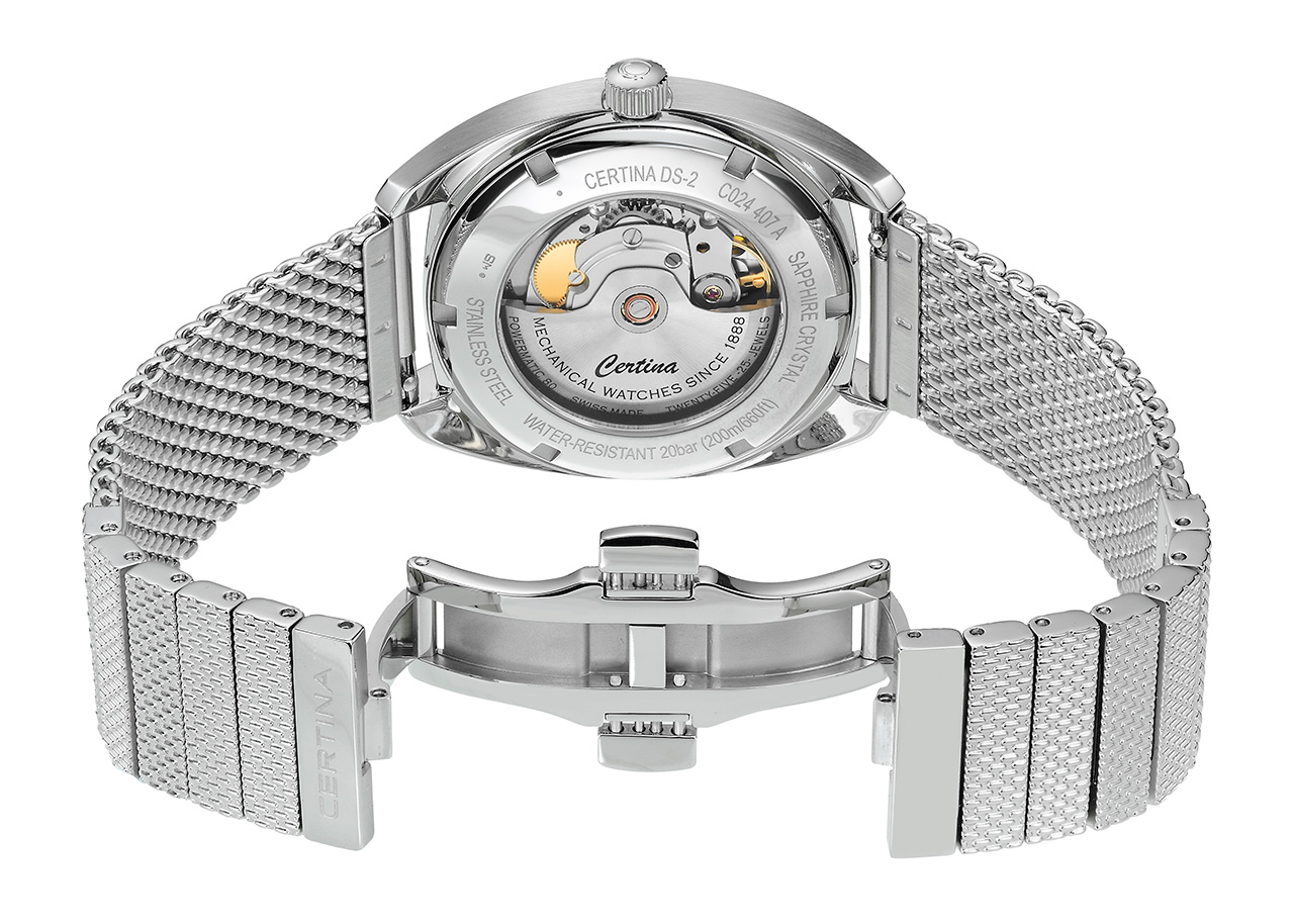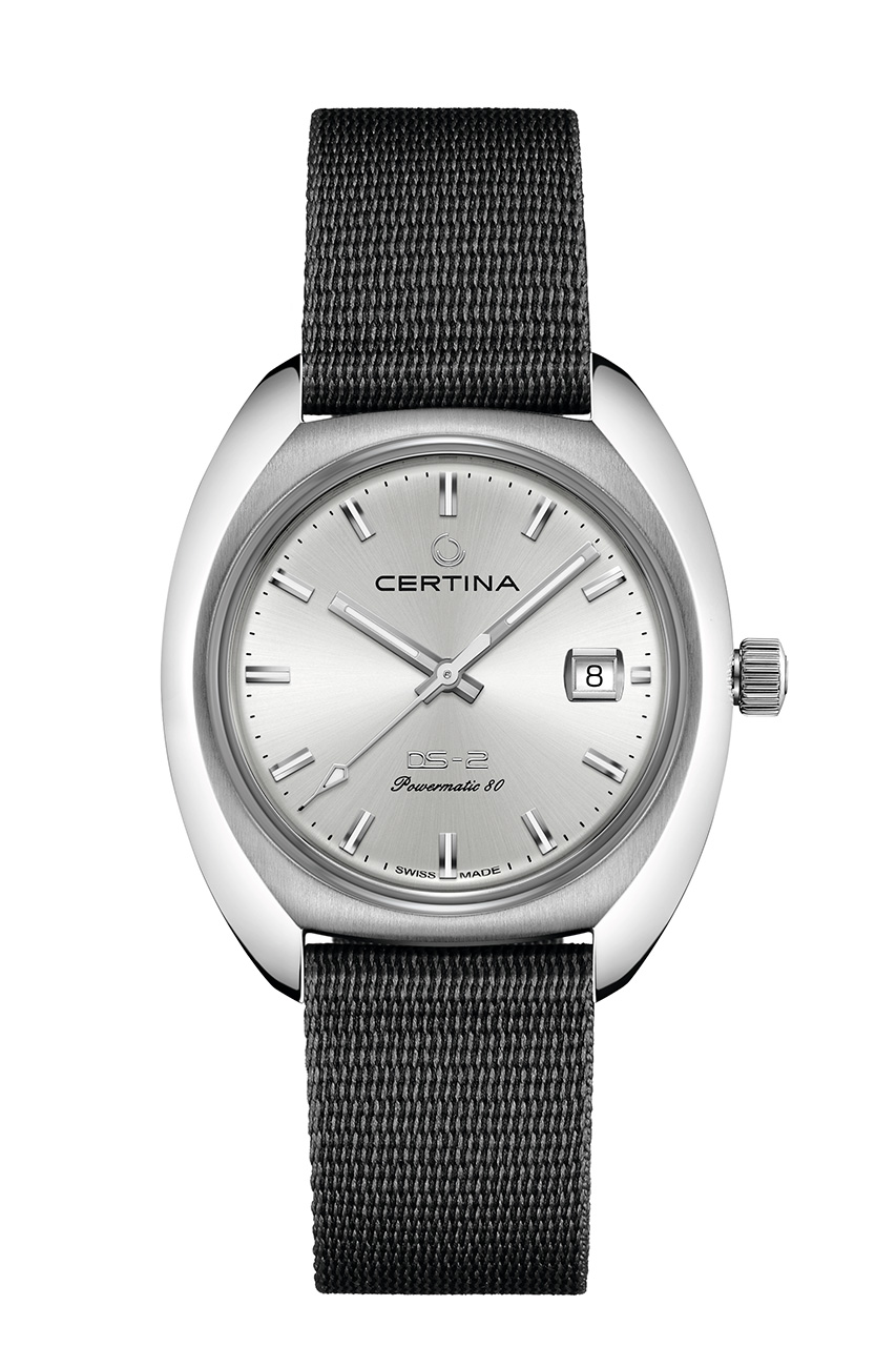 Первая модель DS-2 1968 года выпуска знаменовала новый этап для марки Certina с точки зрения создания прочных часовых механизмов. Она стала естественным и стильным продолжением истории успеха, начавшейся за девять лет до этого с выпуска модели DS-1. Как историческая модель DS-2, так и ее современное исполнение отличаются бочкообразной формой корпуса, формой «обрезанного с двух сторон эллипса», как гласила реклама 1968-го года. Сглаженные углы и грани сочетаются с круглым циферблатом, защищенным сапфировым стеклом. Новые часы DS-2 доступны в четырех вариантах исполнения – в матовом черном или серебристом оттенках, с синим или черным сатинированным циферблатом. Прямоугольные стрелки и индексы с покрытием Super-LumiNova® подчеркивают винтажный характер модели. Стальной корпус шириной 40 мм и длиной 38 мм дополнен браслетом с миланским плетением или ремешком NATO из материала #tide ocean material®, в основе которого – океанический пластик.