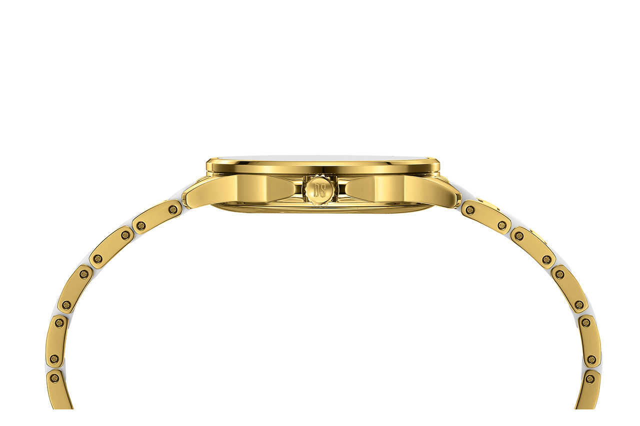 Ваше сердце будет биться чаще в любой день года благодаря классическому элегантному дизайну и теплому оттенку желтого золота модели DS-6 Lady. Корпус диаметром 35 мм из нержавеющей стали с PVD-покрытием с декоративной отделкой в виде сатинирования и полировки идеально располагается на запястье. Широкий безель расширяет белый или золотой циферблат модели. Шесть арабских цифр, утонченные стрелки и индексы, а также дата на отметке «6 часов» дополняют лаконичный дизайн. Часовая и минутная стрелки покрыты качественным люминесцентным составом Super-LumiNova®. Часы комплектуются браслетом из нержавеющей стали с PVD-покрытием. Белые керамические звенья добавляют модные акценты двухцветной версии модели.