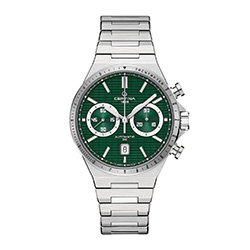 Циферблат выполнен в стиле падель-корта: объёмная сетка-текстура, крупные стрелки и счётчики хронографа создают образ скорости и движения. Автоматический механизм VALJOUX A05.231 с кремниевой пружиной баланса устойчив к магнитным полям, перепадам температуры и ударам: стабильность, рассчитанная на ритм спорта.