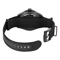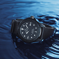 Часы DS Action Diver – фаворит международного клуба поклонников Certina. Новая версия этих современных дайверских часов отличается универсальностью: полностью выполненные в черном цвете, они излучают чарующее сияние. В немалой степени этому способствует толстый слой покрытия Super-LumiNova® на стрелках и часовых делениях, а также на метках на однонаправленно вращающемся безеле. Черное матовое керамическое кольцо безеля идеально подходит для нанесения шкалы времени погружения, цифры на которой покрыты лаком. Корпус из нержавеющей стали диаметром 43 мм имеет PVD-покрытие черного цвета, что идеально гармонирует с остальными деталями часов. Дополнительную ассоциацию с морской стихией вызывает черный тканевый ремешок в стиле ремешков NATO, изготовленный из материала #tide ocean material®. Ремешок из экологичного материала на основе выловленного в океане пластика имеет классическую застежку с черным PVD-покрытием.