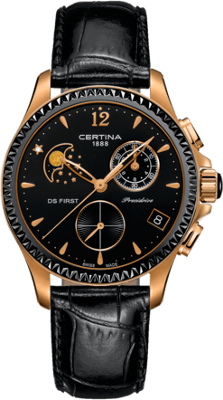 3. Certina DS First Lady Chronograph Moon Phase C030.250.36.056.00 Корпус из нержавеющей стали с розово-золотым PVD-покрытием, чёрный керамический безель. Чёрный глянцевый циферблат с бриллиантом Top Wessselton VS-SI 0,0038 карата; центральные стрелки, условные часовые индексы, цифра «12», секундный субциферблат, 30-минутный счётчик хронографа, рамка окошка даты и оправа бриллианта – с розово-золотым PVD-покрытием. Чёрный кожаный ремешок с застёжкой-бабочкой на двух кнопках. |