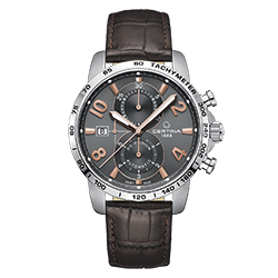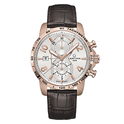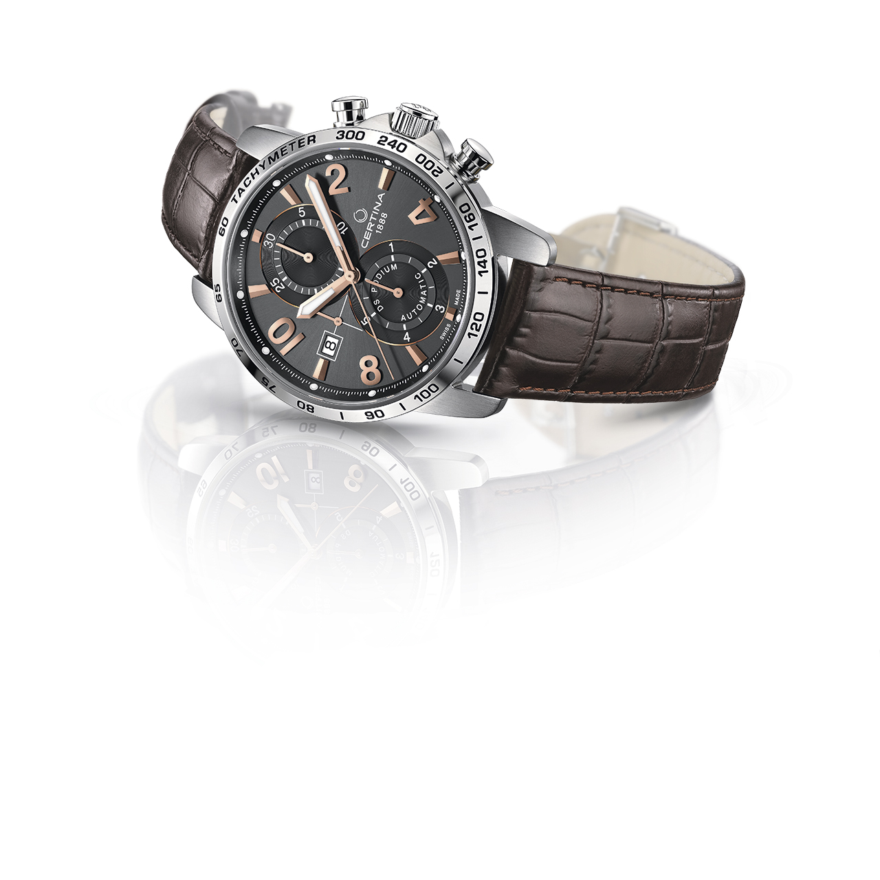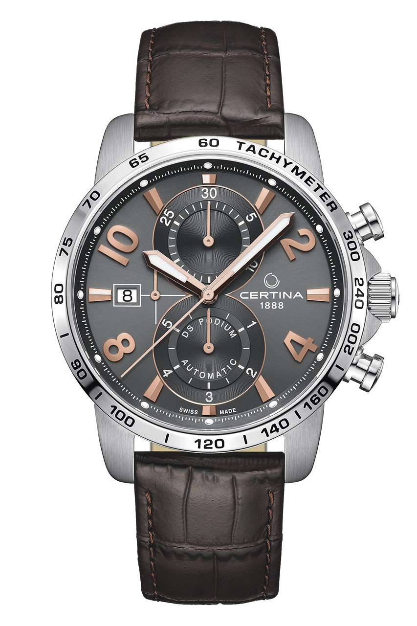 Часы DS Podium – это классическая спортивная модель Certina. Ее новейшее воплощение привносит в коллекцию современные нотки: корпус из нержавеющей стали диаметром 44 мм обрамляет серый циферблат с гильоше «Солнечные лучи». Стильный акцент задают элементы с напылением из красного золота – крупные цифры и часовые отметки, стрелки и элегантная отделка счетчиков хронографа. Эффектные кнопки расположены сбоку от завинчивающейся заводной головки с системой защиты. Темно-коричневый ремешок из телячьей кожи с тиснением под крокодила и застежка-бабочка обеспечивают надежную и комфортную посадку на запястье.