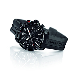 C001.647.27.057.00 – чёрный циферблат, серебристый корпус с чёрной тахиметрической шкалой, чёрный каучуковый спортивный ремешок.