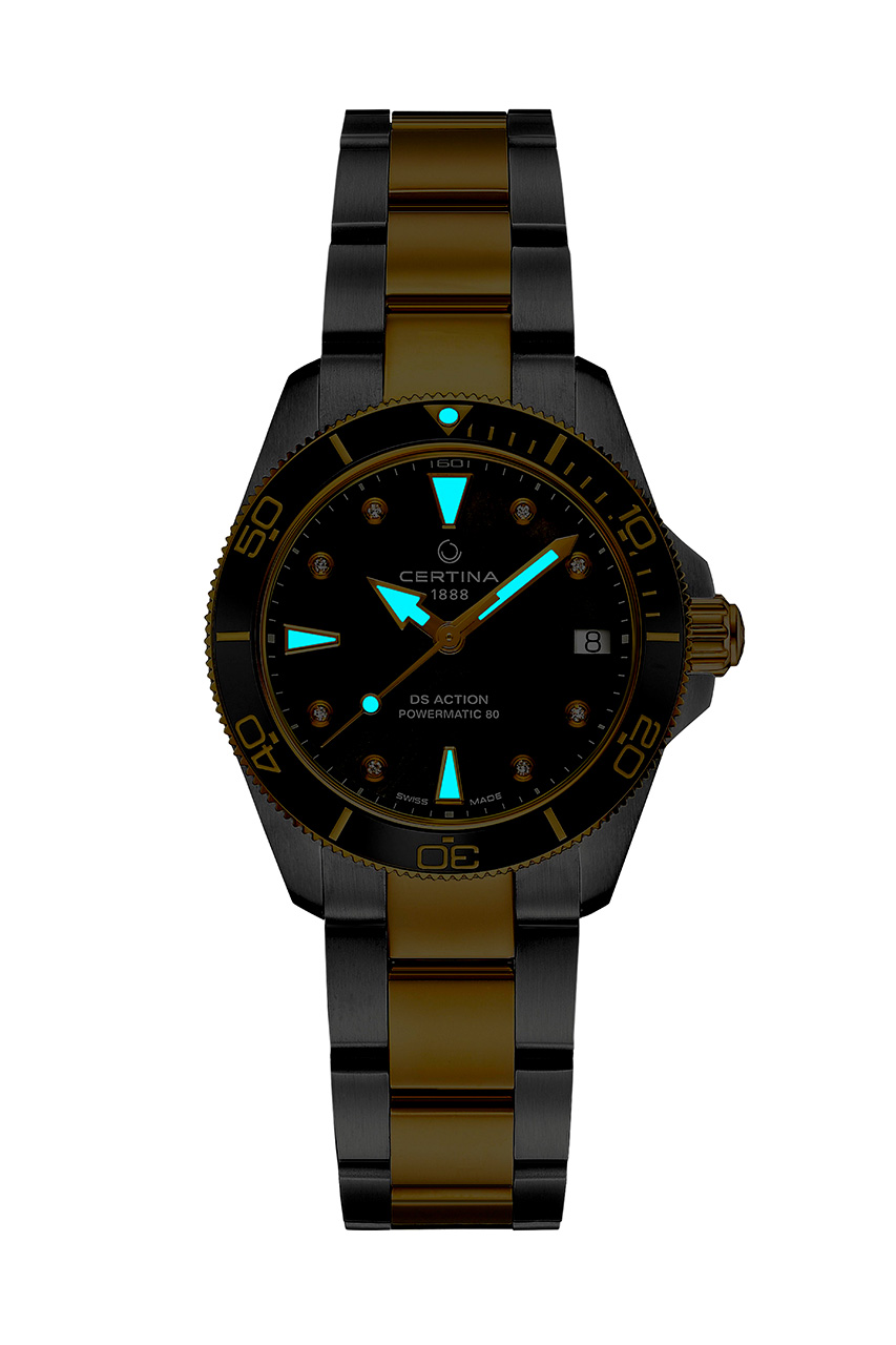 - Стрелки и индексы с покрытием Super-LumiNova® цвета желтого золота.