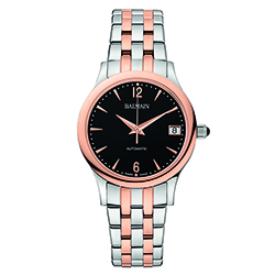 9. Classic R Lady Automatic B3998.33.64: стальной корпус с PVD-покрытием розовым золотом, стальной браслет с PVD-покрытием розовым золотом чётных звеньев; чёрный циферблат, украшенный гильоше в стиле «солнечные лучи» (Rayonne) с арабскими цифрами 6, 12 и девятью условными индексами с PVD-покрытием розовым золотом. | |