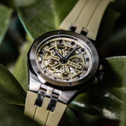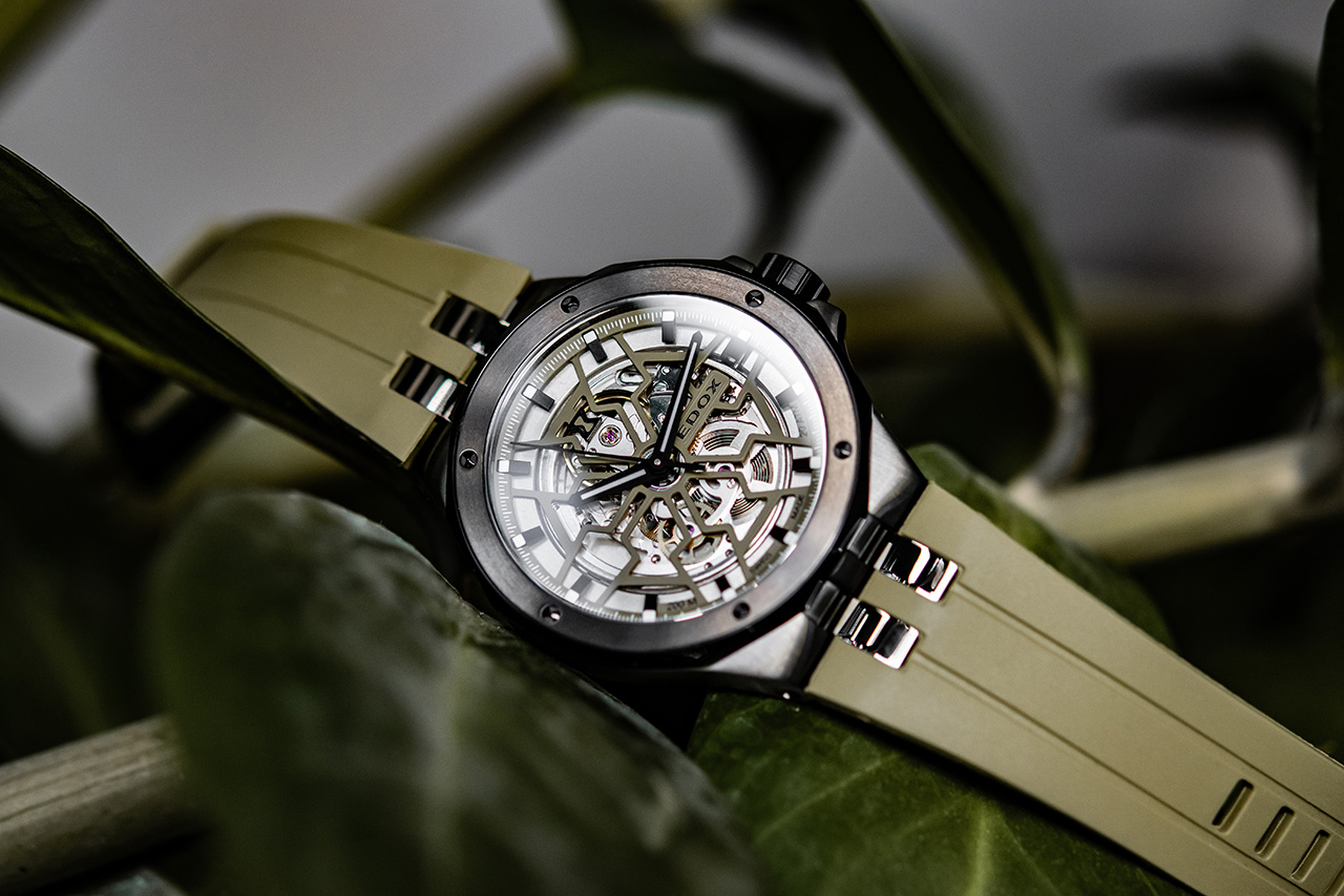 Часы Delfin Mecano от Edox стали настоящим хитом среди любителей часов по всему миру. Теперь бутик швейцарского часового производителя расширяет семейство Delfin Mecano новой моделью, выполненной в изысканной прохладной цветовой гамме. Сочетание грифельно-серого безеля и выступов в сочетании с ремешком цвета мха и скелетонизированными вставками на циферблате создает на запястье смелый, но утонченный вид часов.