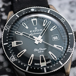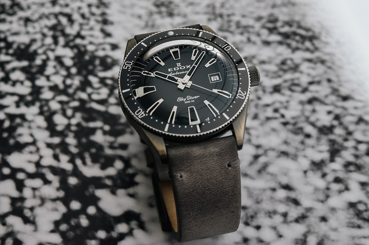 Еще одним «винтажным» штрихом является специальное покрытие, нанесенное на ремешок из серой кожи. Покрытие создает «складки» на ремешке – еще один ностальгический штрих. SkyDiver Date Automatic также поставляется с альтернативным ремешком из коричневой кожи, который можно легко заменить. Под капотом находится механизм с автоподзаводом Edox Calibre 80, изготовленный швейцарским специалистом Sellita, а внешний керамический безель, устойчивый к царапинам, обеспечивает практичный инструмент для расчета времени погружения на глубину до 300 метров ниже уровня моря.