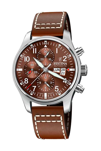 Линейка Swiss Made бренда Festina пополнилась механическими часами с автоподзаводом – хронографом F20150. Эти часы выполнены в традиционном дизайне пилотских часов с красной стрелкой.