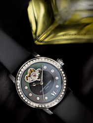 Новые часы "Black Beauty" с насыщенно чёрным, перламутровым циферблатом и россыпью бриллиантов способны сфокусировать на себе внимание даже самых пристрастных ценителей часового искусства, поскольку внешний вид Black Beauty достаточно оригинален. Его квинтэссенцией является запатентованный дизайн циферблата, на котором находится отверстие, по форме похожее на два слившихся сердца, демонстрирующих пульсацию механизма часов. Эта дизайнерская находка превращает часы "Black Beauty" в некий сплав чувственности и романтизма, который выводит их за пределы обычного представления о часах.