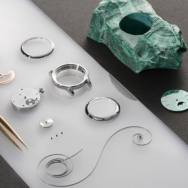 Использование малахита в качестве материала для циферблата — новинка для бренда. Этот минерал символизирует обновление, а его богатая палитра зелёных оттенков делает каждый экземпляр уникальным. Текстура камня с естественными прожилками варьируется от светлого до почти чёрного зелёного, создавая выразительный и благородный визуальный акцент. В сочетании с корпусом из белого золота и усложнённой индикацией фазы Луны, часы обретают статус коллекционной вещи.