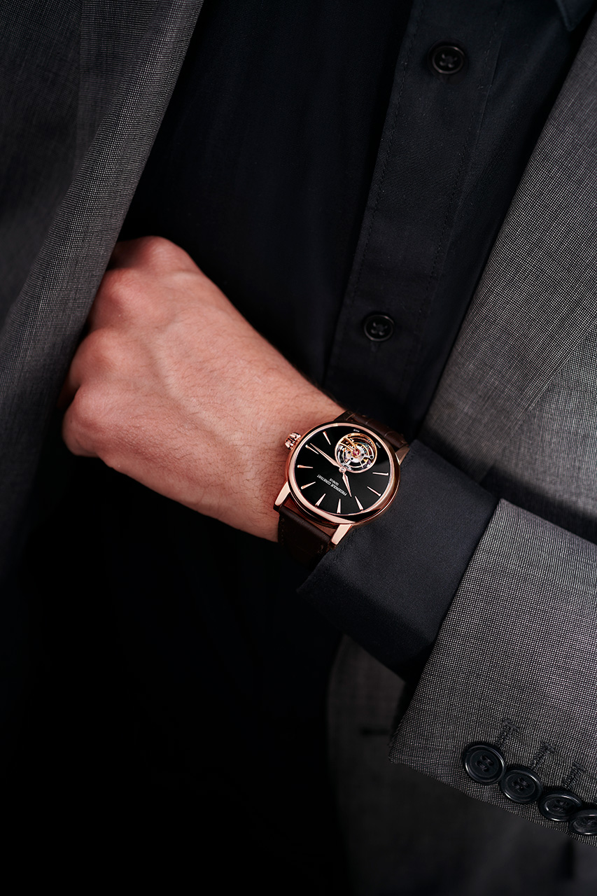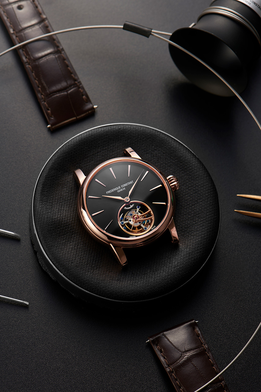 Дизайн Classic отражает традиционное швейцарское производство часовых механизмов, возведенное в главный принцип развития компании Frederique Constant. Турбийон в 39-мм корпусе из 18-каратного розового золота, выпущен ограниченной серией в 150 экземпляров. Турбийон величественно размещен в положении "6 часов" и является великолепным образцом высокого часового мастерства. Этот механизм, с кремниевым спусковым колесом и рычагом, обеспечивает высокую точность часов, нечувствительную к магнитным полям и перепадам температуры. Секундная стрелка, парящая над кареткой, состоит из 81 компонента. Она имеет индивидуальную гравировку с серийным номером каждого экземпляра. Механизм, с отделкой в лучших традициях часового искусства, обеспечивает запас хода 38 часов.