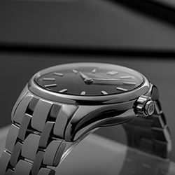 Вторая монохромная модель окрашена в серый цвет. Эта сдержанная и элегантная версия в современном стиле более чувствительна к свету, чем часы черного цвета. Отличительной особенностью модели является увлекательная игра отражений, теней и контрастов. Накладные индексы хорошо выделяются на фоне циферблата, а полированные стрелки парят над циферблатом с узором в виде солнечных лучей в изысканном хроматическом танце.