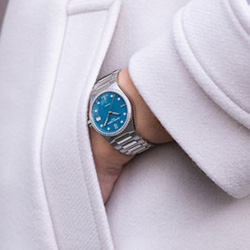 Женская версия, представленная в 2021 году, объединяет в себе все традиционные часовые коды: изящно изогнутый круглый корпус диаметром всего 34 мм, изысканно декорированный автоматический механизм «Swiss Made», видимый через сапфировую заднюю крышку.