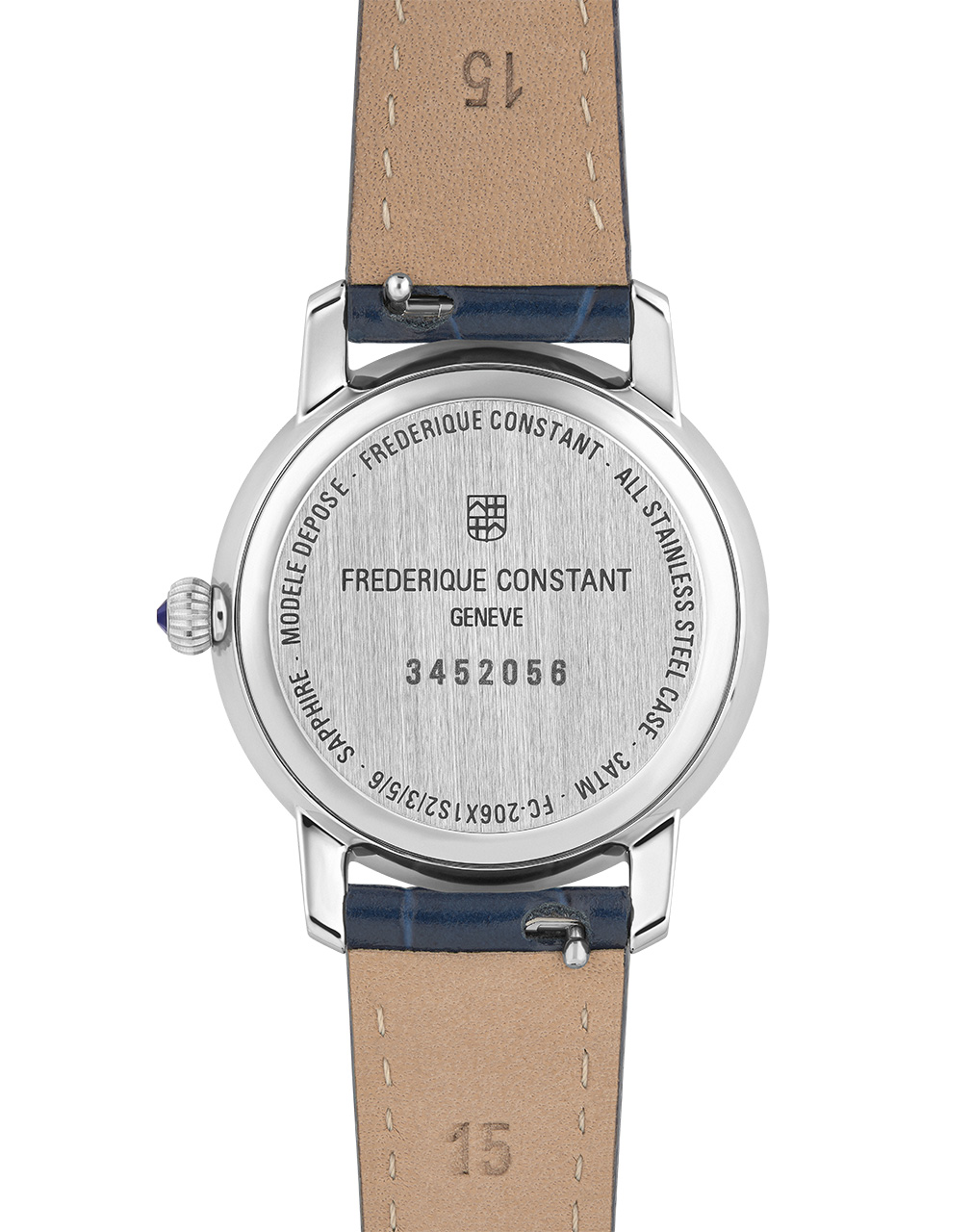 В то же время две новые модели Slimline Ladies Moonphase вобрали в себя и достижения технического прогресса в часовой индустрии: в их сердце бьется кварцевый механизм FC-206 с элементом питания, рассчитанным на пять лет работы. Калибр приводит в движение две центральные (часовую и минутную) стрелки в виде листьев с плавным изгибом в центре, которые также выдержаны в перламутрово-черном оттенке. В нижней части циферблата, в положении «6 часов», находится указатель фаз Луны в форме полумесяца, на котором естественный спутник Земли предстает во всем своем великолепии в окружении звезд на темно-синем фоне, напоминающем ночное небо.