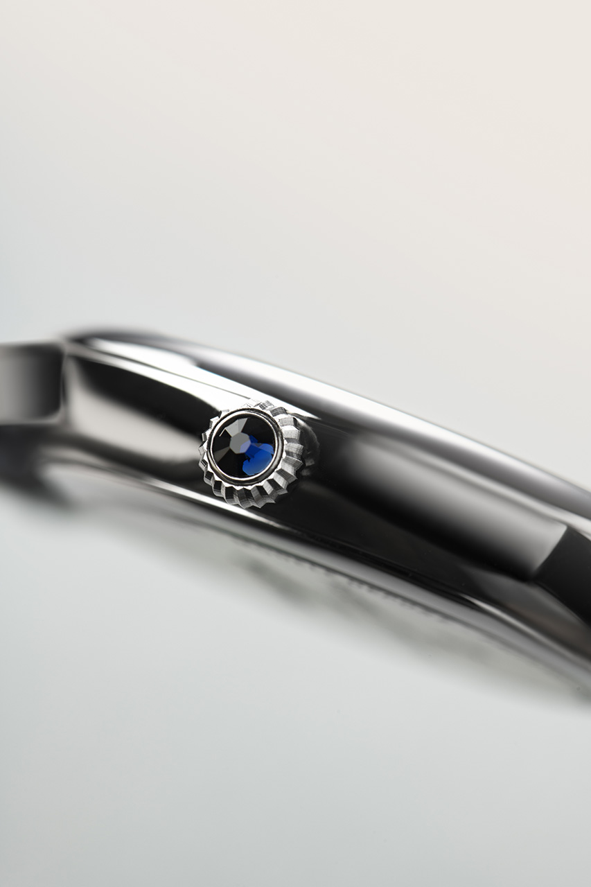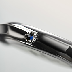 В отличие от предшественниц в новых моделях лишь метка в положении «12 часов» выполнена в виде римской цифры XII. По обе стороны от нее, на обновленной минутной шкале по периметру циферблата расположены по пять арабских цифр. Мерный бег разметки деликатно прерывает надпись Swiss Made в положении «6 часов», которая служит подлинным свидетельством высокого качества изделия. Эта изящная интерпретация минутной шкалы, известная под названием «железная дорога», напоминает дизайн «секторных циферблатов», которыми оснащались культовые модели 1920–1940-х годов. Стремление к большей эстетической привлекательности нашло воплощение в заводной головке в форме луковицы, увенчанной элегантным синим камнем огранки кабошон.