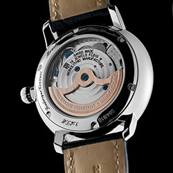На оборотной стороне прозрачная задняя крышка обеспечивает полный обзор автоматического калибра FC-810. В традиционном декоре женевские полосы сочетаются с жемчужным зернением, а колеблющийся груз имеет ажурную структуру.
