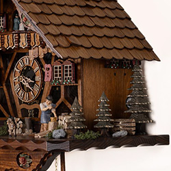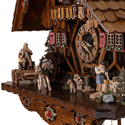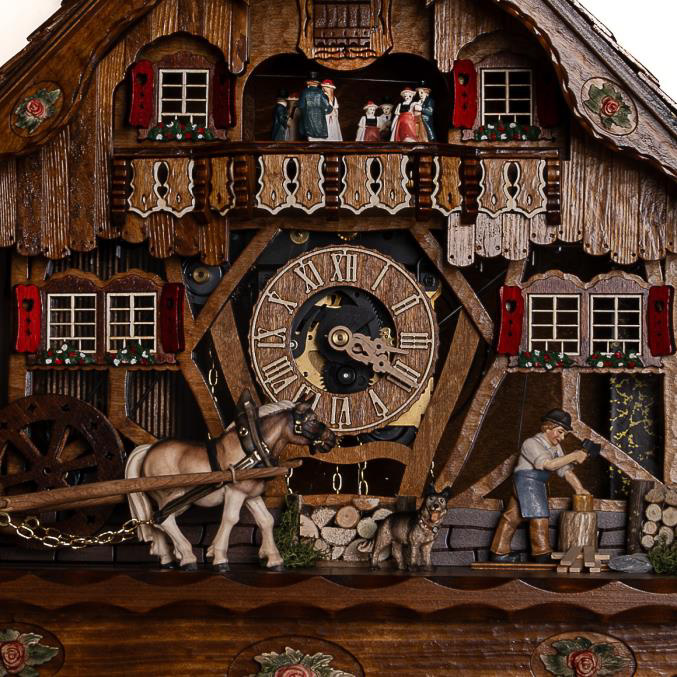 - На переднем плане — миниатюрная сцена из сельской жизни: запряжённая лошадь везёт телегу с бочками, а рядом располагается дровосек, который начинает рубить дрова всякий раз, когда кукушка выходит из своего домика.
