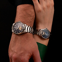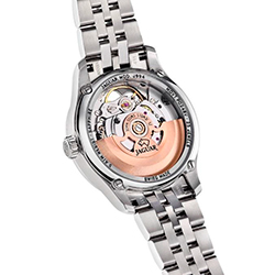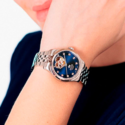 Подобный дизайн отсылает к философии открытости и романтики. Благодаря сапфировому стеклу с обеих сторон можно наблюдать за работой автоматического калибра Soprod P024, разработанного в Швейцарии - родине точности и часового искусства. А декоративные элементы, от сатинированного циферблата с эффектом «солнечных лучей» до сияющих кристаллов циркония в роли часовых индексов, превращают часы в роскошный ювелирный аксессуар.