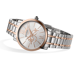 Модели, занимающие центральное место в коллекции, представлены в двухцветном исполнении. Розово-золотой корпус и тонкие звенья браслета безупречно сочетаются с мощными арабесками циферблата. Накладные римские цифры в положении «12» и «6 часов» задают симметрию и распорядок дня современной женщины, где всегда есть место стилю. Помимо вариантов дизайна в желто-розовых тонах в коллекции присутствуют часы с серебристым металлическим покрытием. Также линейка Laelia Lady II отличается большим разнообразием креплений и отделок циферблата. Модели имеют круглый корпус диаметром 32 мм с идеально выгравированными окружностями по краям, оснащены швейцарским кварцевым механизмом ETA E63.031.