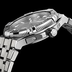 Циферблат черного и синего цвета с отделкой «солнечные лучи» подчеркивает стиль и универсальный характер часов AIKON Venturer. Чередующиеся круглые и прямоугольные индексы покрыты люминесцентным составом SuperLuminova. Крупные прямоугольные стрелки соответствуют тенденциям в дизайне профессиональных часов для подводного плавания. Запоминающийся яркий дизайн и высочайший уровень качества соответствует самым высоким требованиям часового мастерства.
