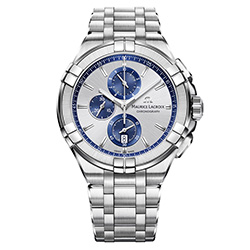 4. Maurice Lacroix Aikon Chronograph AI1018-SS002-131-1 Корпус из нержавеющей стали с сатинированной отделкой поверхности и полированной отделкой декоративных звеньев. Серебристо-синий сатинированный циферблат: центральные стрелки с алмазной обработкой, родиевым покрытием и люминесцирующими вставками на стрелках часов и минут; условные индексы с родиевым покрытием, малая секундная стрелка, 30-минутный счётчик, счётчик 1/10 секунды, окошко даты. 5-рядный браслет из нержавеющей стали с сатинированной отделкой, с двойной раскладывающейся застёжкой из нержавеющей стали на двух кнопках с сатинированной и полированной отделкой и круговым зернением. |