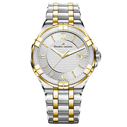 1. Maurice Lacroix Aikon Gents AI1008-PVY13-132-1 Корпус из нержавеющей стали с полированной отделкой поверхности, безеля и декоративных звеньев. Внешняя кромка безеля и декоративные звенья – с жёлто-золотым PVD-покрытием. Серебристый сатинированный циферблат с контрастной отделкой в центре в технике гильоше в виде широких горизонтальных полос: центральные стрелки с PVD-покрытием из жёлтого золота и люминесцирующими вставками на стрелках часов и минут; условные индексы, римские цифры и окошко даты с жёлто-золотым PVD-покрытием. 5-рядный браслет из нержавеющей стали с сатинированной и полированной отделкой, чётными рядами звеньев с жёлто-золотым PVD-покрытием, с двойной раскладывающейся застёжкой из нержавеющей стали на двух кнопках с сатинированной и полированной отделкой и круговым зернением. |